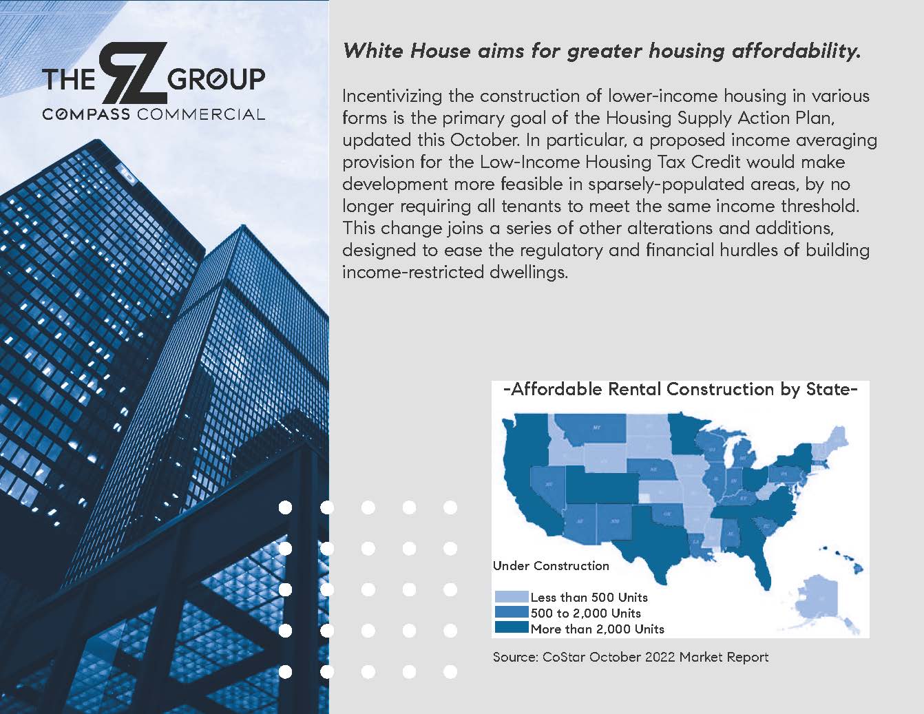 White House aims for greater housing affordability. Incentivizing the construction of lower-income housing in various forms is the primary goal of the Housing Supply Action Plan, updated this October. In particular, a proposed income-averaging provision for the Low-Income Housing Tax Credit would make development more feasible in sparsely-populated areas, by no longer requiring all tenants to meet the same income threshold. This change joins a series of other alterations and additions, designed to ease the regulatory and financial hurdles of building income-restricted dwellings. Addressing housing affordability is becoming a priority for the Biden administration after steep home price run-ups directed excess demand to apartments and drove up rental costs.